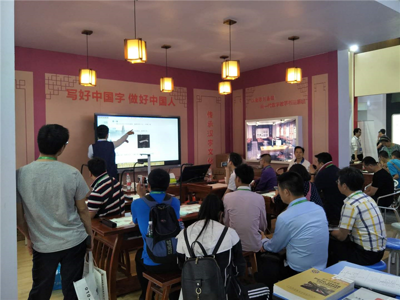 工作人員在向參觀客戶講解數(shù)字書法教室的授課知識