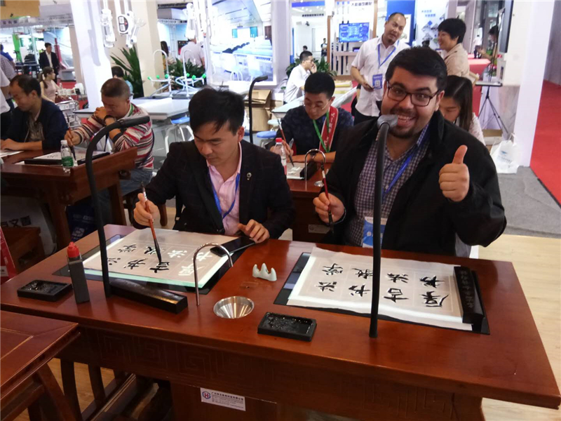參觀客戶在體驗數(shù)字書法